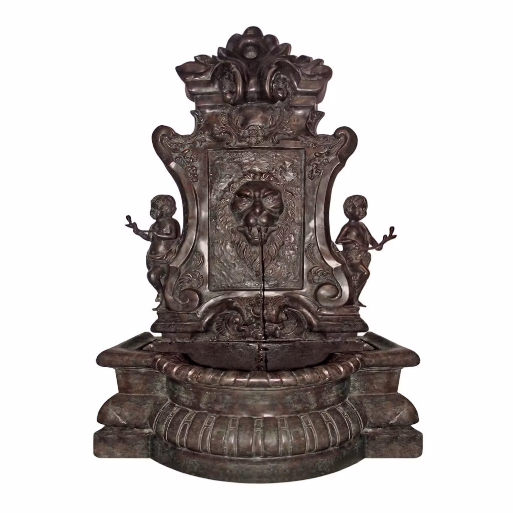 Große Wandbrunnen aus Bronze mit Löwe und Keruben. H125cm Handgefertigt im cire perdue Verfahren. Einzigartiges Einzelstück mit klassischem Charakter.