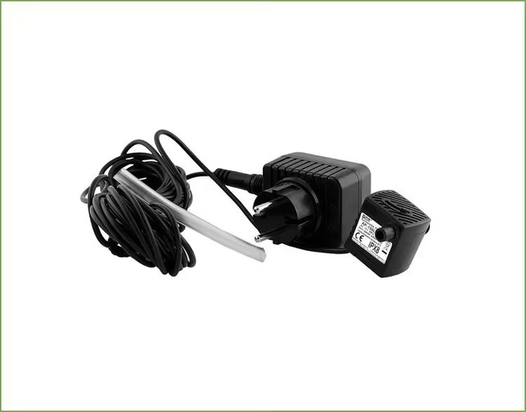 Die Pumpe (ohne Beleuchtung) hat kompakte Abmessungen von 4 × 3 × 3 cm und ist mit allen unseren kleinen Fontänen kompatibel. Sie wird mit 12 Volt betrieben, wobei der Transformator direkt im Stecker integriert ist und nach IP44 klassifiziert ist. Dadurch ist die Pumpe für feuchte Umgebungen geeignet. Die Kabellänge beträgt großzügige 8 Meter, was eine flexible Platzierung ermöglicht.