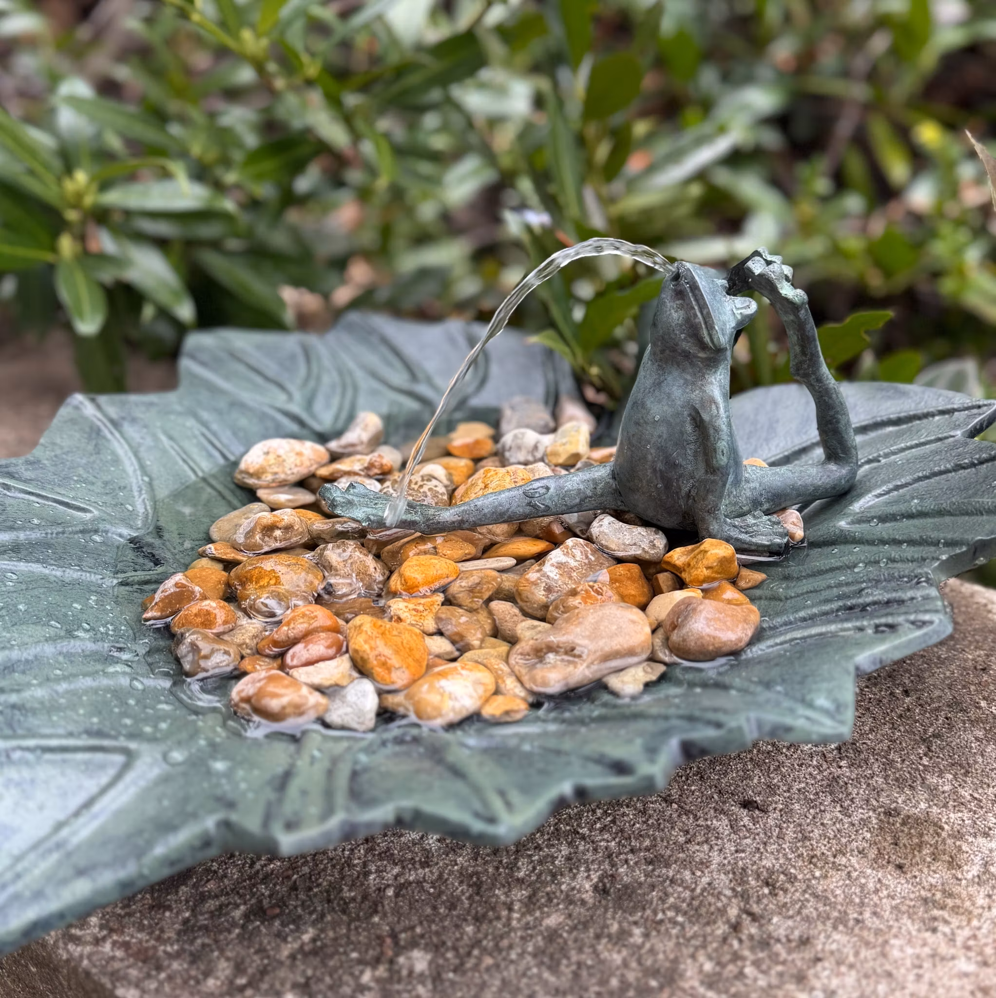 Gartenbrunnen Komplett Set mit sitzendem Bronze Frosch 10 cm mit angewinkeltem Hinterbein inklusive Pumpe 150 Liter pro Stunde, Blattschale und Schlauch.