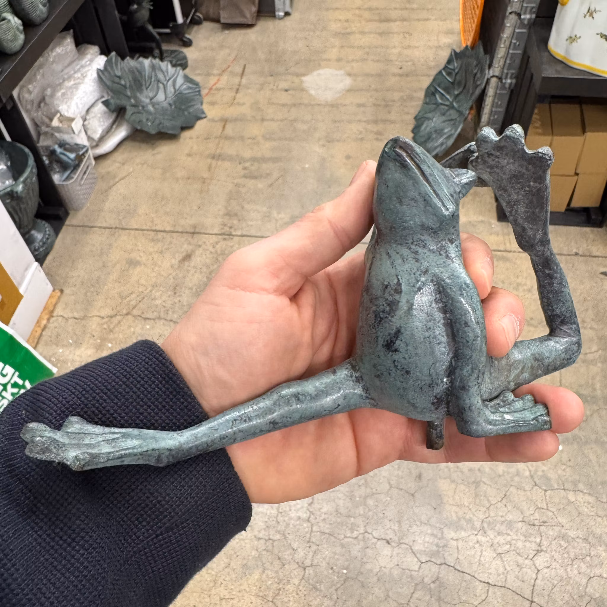 Im Set enthalten ist eine ausdrucksstarke sitzende Froschfigur aus hochwertiger Bronze mit angewinkeltem Hinterbein. Die natürliche und lebendige Haltung verleiht der Figur einen besonderen Charakter und macht sie zu einem echten Blickfang.