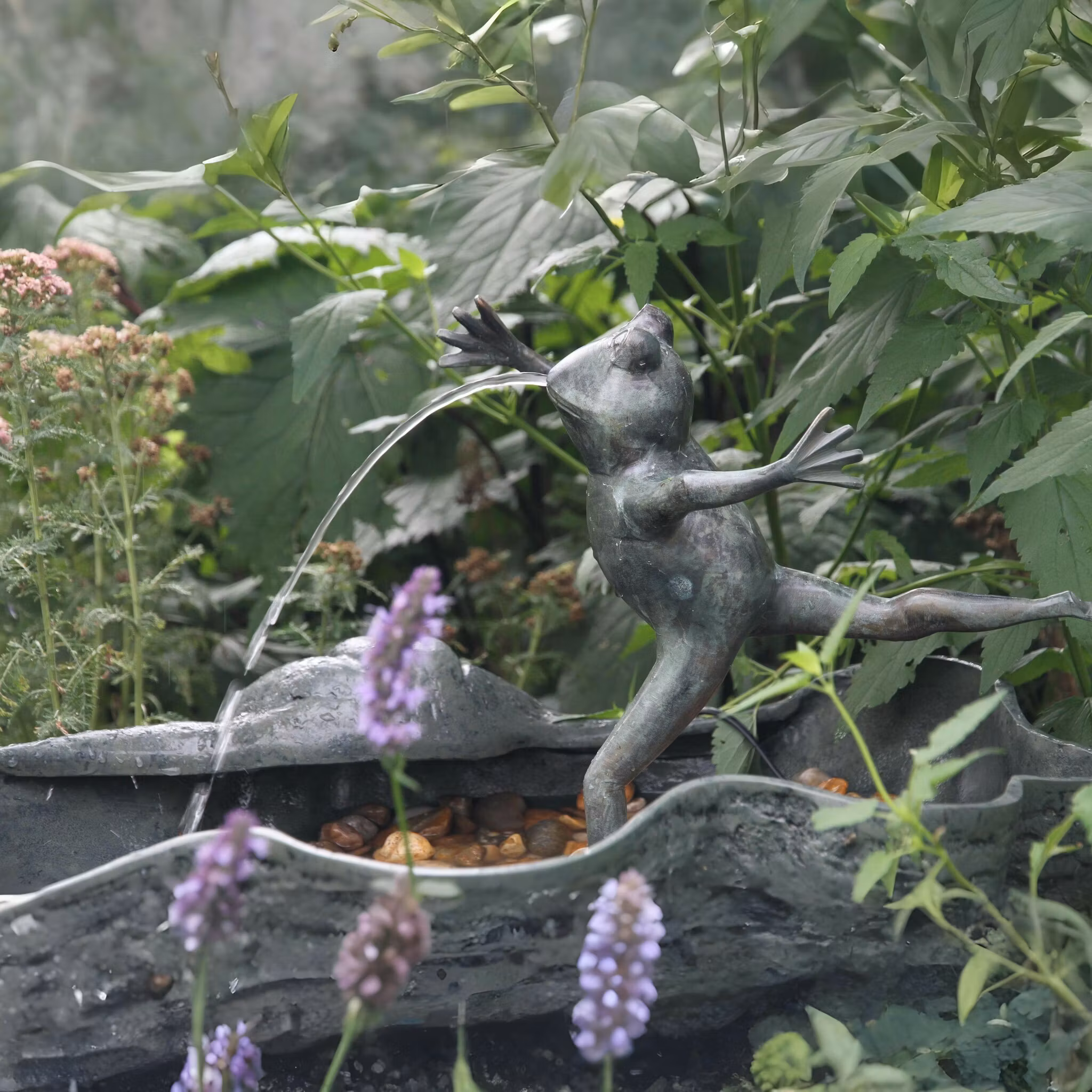 Diese außergewöhnliche Froschbrunnen haben wir "Laufender Frosch“ genannt. Der Name ist bewusst schlicht gewählt, denn die Figur vermittelt eindeutig Bewegung. Als wäre der Frosch gerade losgelaufen, um den Garten zu erkunden oder sich vielleicht auf den Weg zu einem erfrischenden Bad im nächsten Teich gemacht. Seine Haltung lässt Raum für Fantasie, er ist unterwegs, in seinem eigenen gemächlichen Tempo.