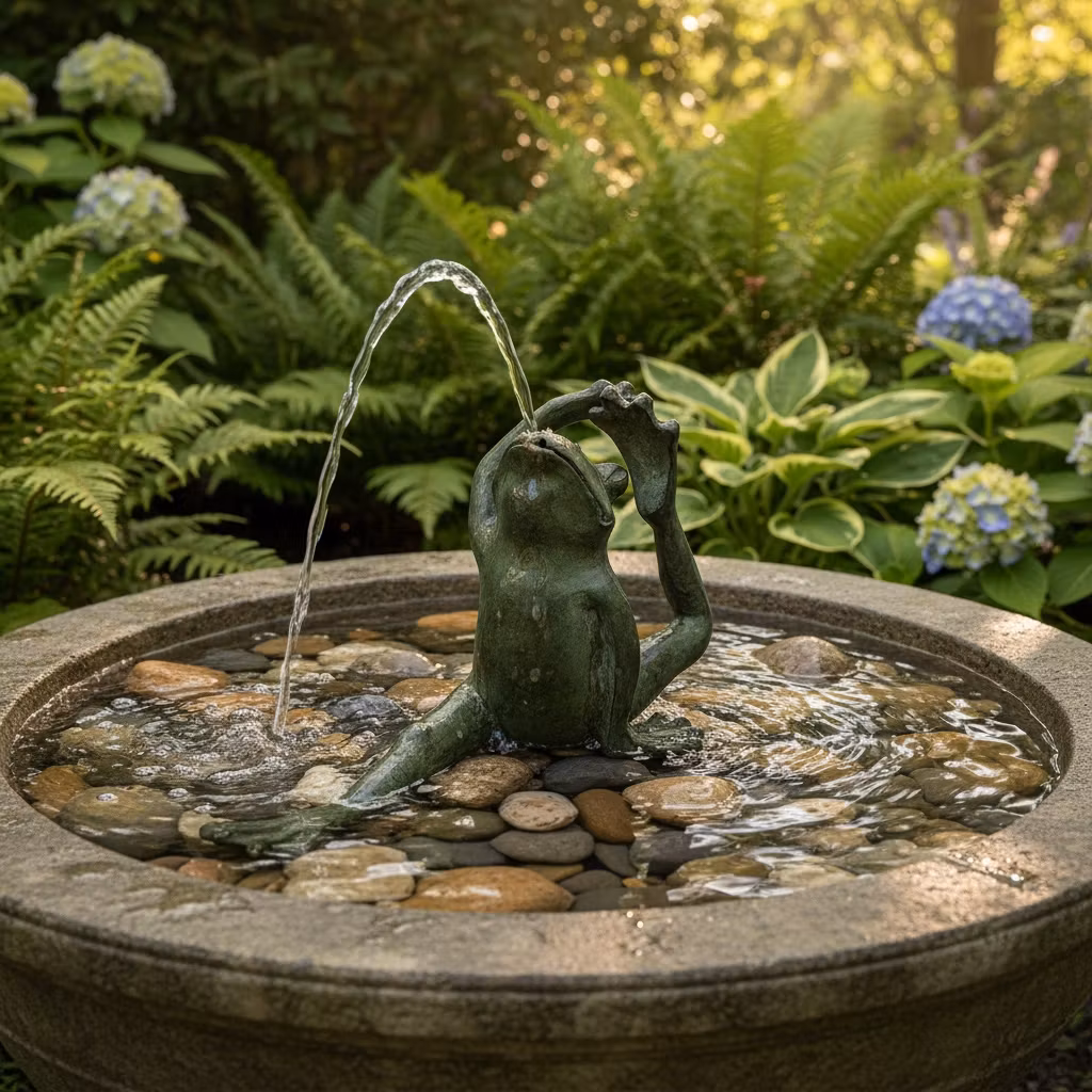 Dieser Froschbrunnen aus Bronze zeigt einen sitzenden Froschfigur mit angewinkeltem Hinterbein in einer natürlichen und ausdrucksstarken Haltung. Die besondere Position verleiht der Figur Charakter und macht sie zu einem dekorativen Blickfang in Wasserschalen und Fontänenbecken.