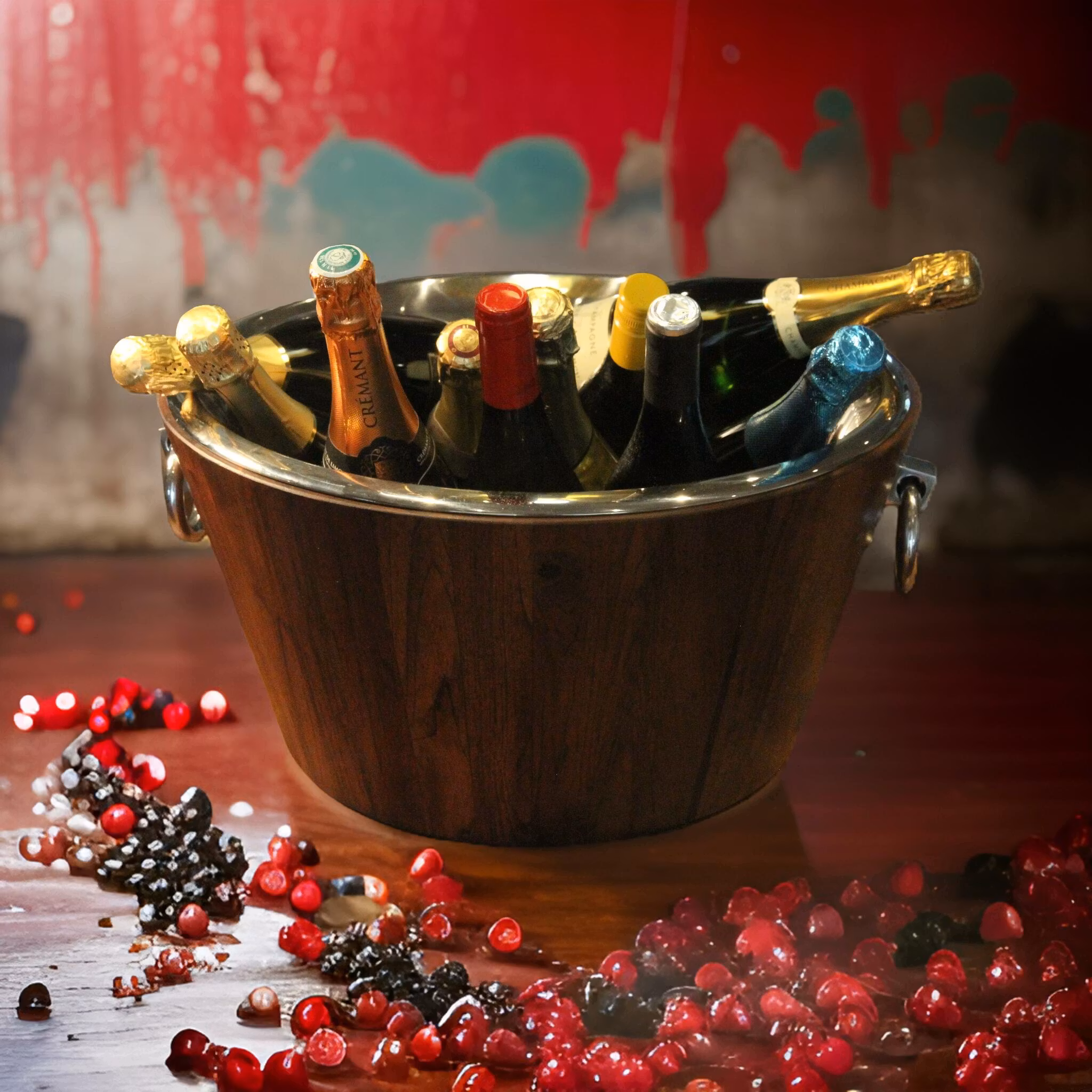 Großer Champagner und Weinkühler aus Teakholz und Edelstahl Ø 46 cm. Platz für bis zu 10 Flaschen, ideal als Mittelpunkt jeder Feier.