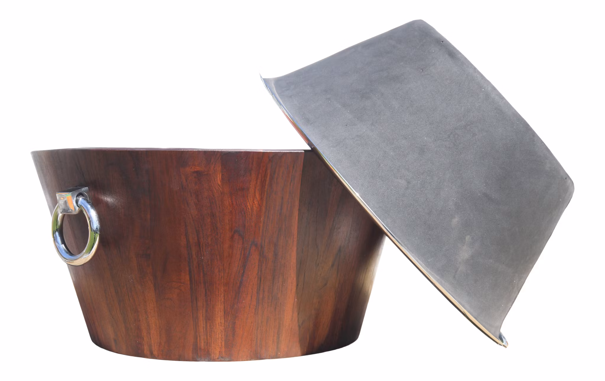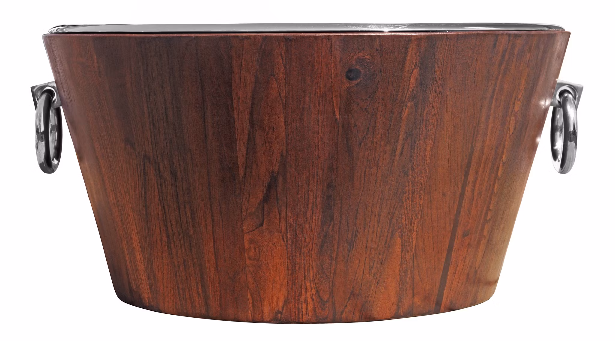 Das äußere Gehäuse besteht aus recyceltem Teakholz, das dem Kühler eine warme und natürliche Ausstrahlung verleiht. Die innere Schale ist aus hochwertigem Edelstahl gefertigt und außen gummiisoliert, um die Kälte besonders lange zu halten. Diese Konstruktion sorgt dafür, dass Getränke über längere Zeit optimal gekühlt bleiben.